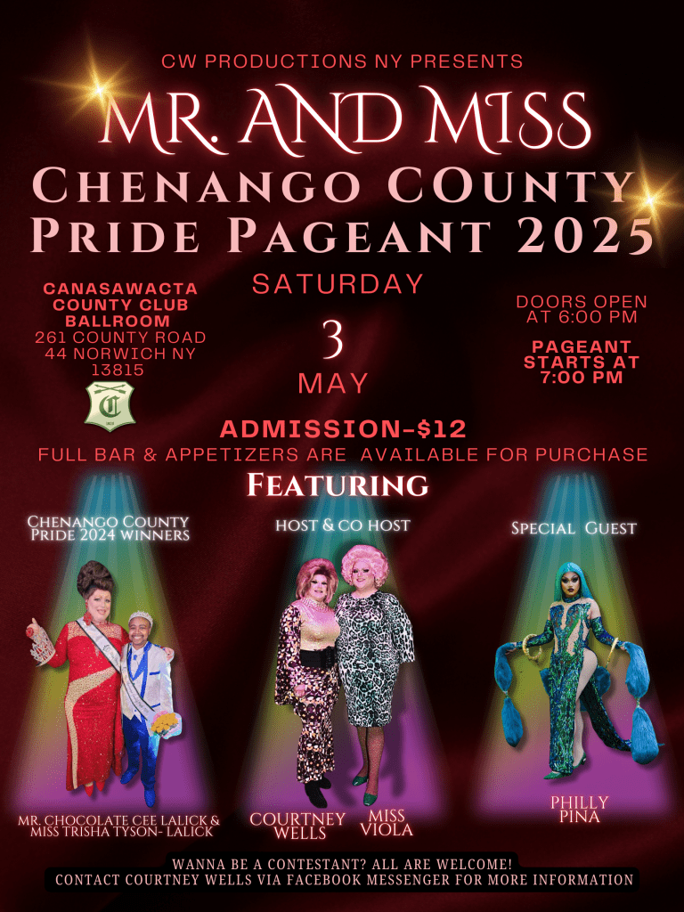 The Mr. and Miss Chenango County Pride pageant, directed by CW Productions NY, is a relatively new addition to the local pageant scene in Norwich, NY. The pageant began in 2024 creating a space for celebrating diversity and pride within the community. We aim to promote self-confidence, community involvement, and the celebration of individuality. The Chenango County Pride Pageant goes along with the Chenango County Pride Festival which is under the direction of Chenango County Pride Alliance, Inc. and is held every year in July. This pageant is held every year on the first Saturday of April or May.